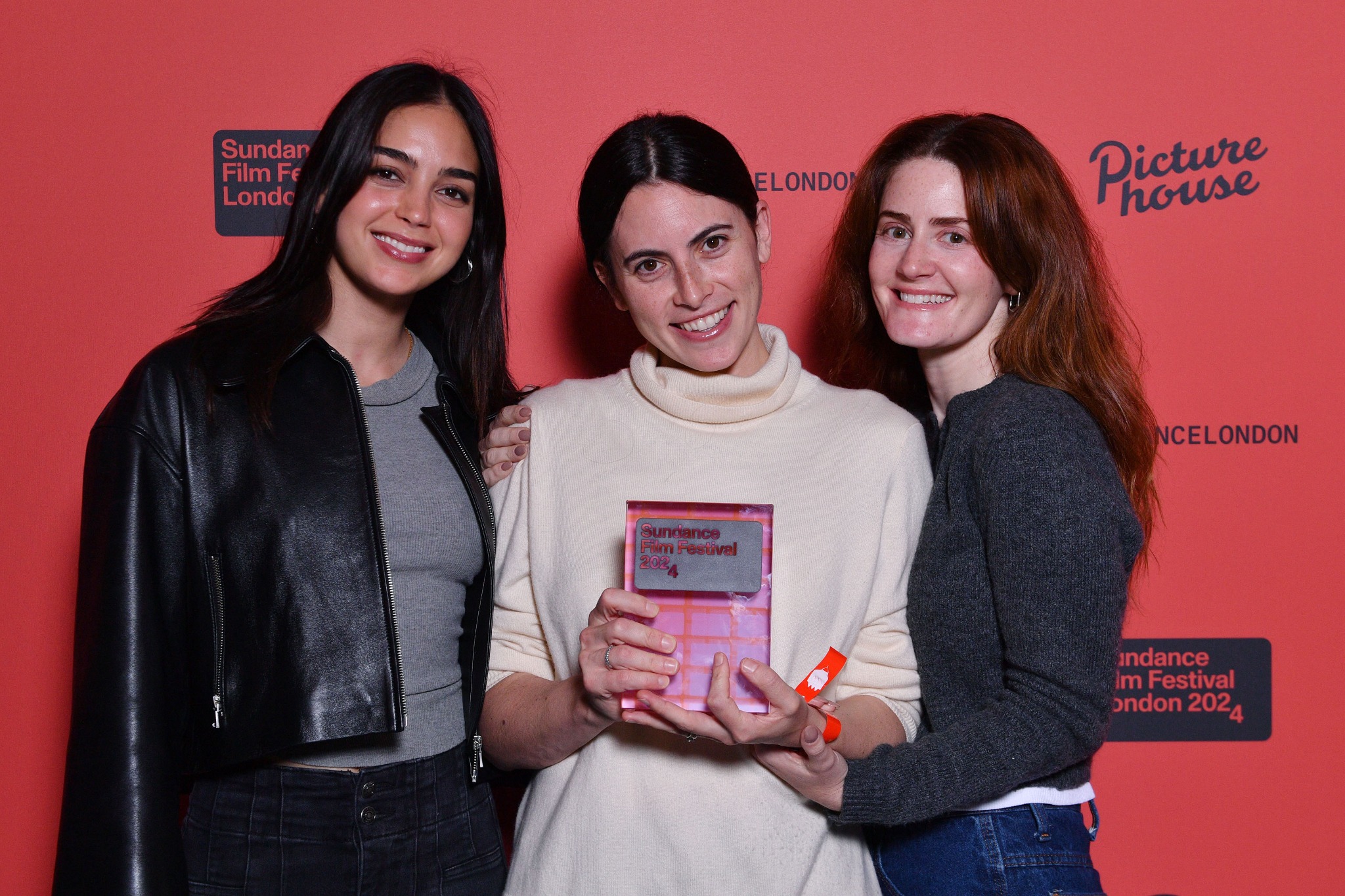 Melissa Barrera, Caroline Lindy, and Kayla Foster accepting with their award at Sundance London